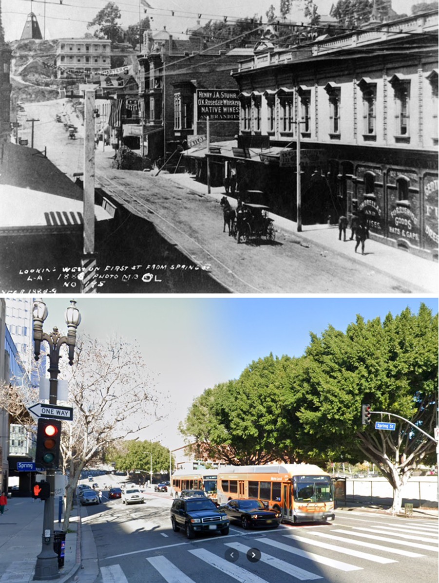 | (1880 / 2023)* - Looking southwest along Second Street (foreground) and Olive Street (intersecting at the upper right) in Bunker Hill, where the steep slope has long posed challenges for walking, biking, and even horse-drawn carriages. Photo comparison by Jack Feldman. |