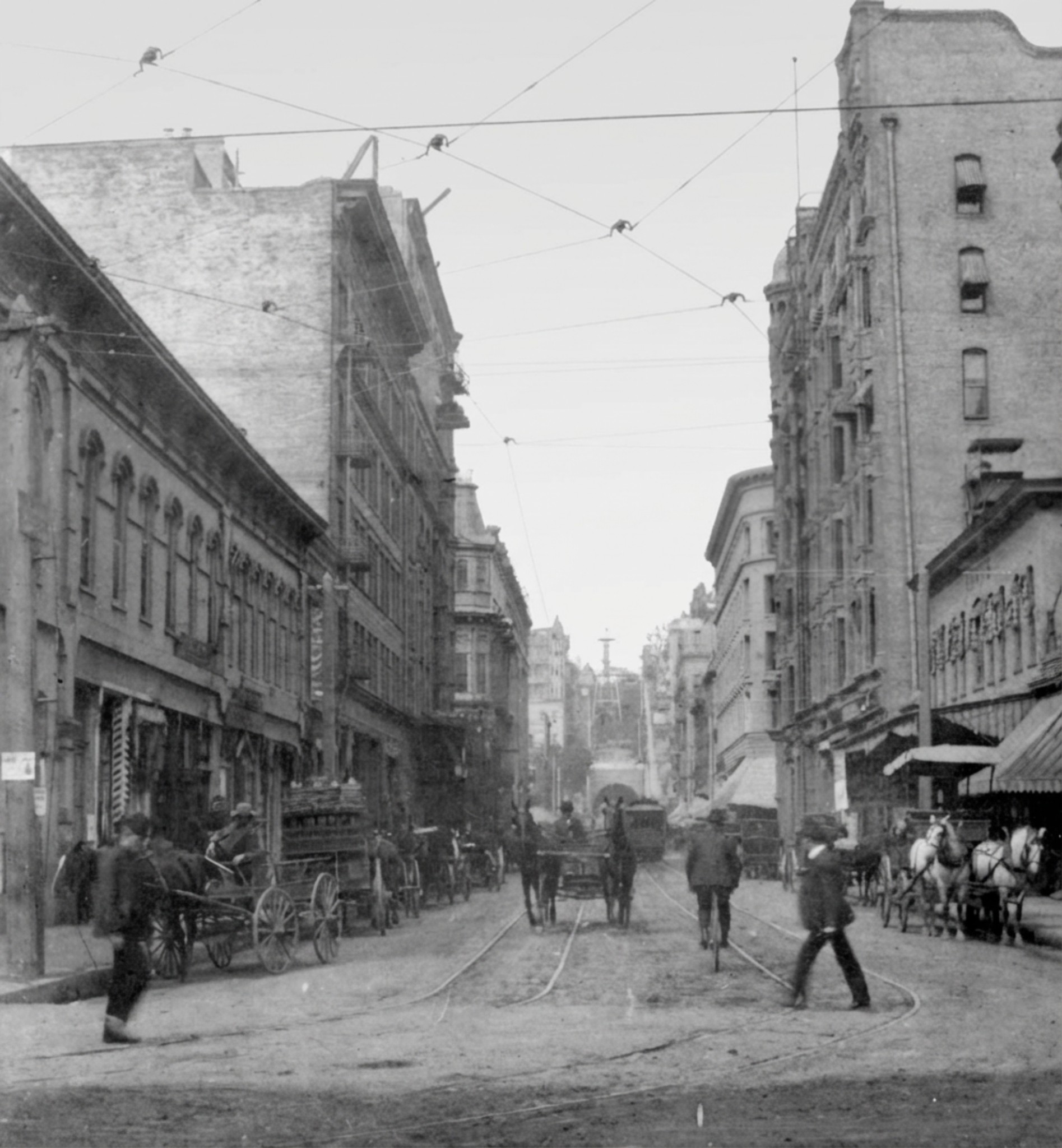 | (ca. 1900)^ - Street view of Broadway looking north from 3rd Street. Trolleys as well as horses and carriages are seen on the street. City Hall can be seen down the street on the right (tall tower and flag). |