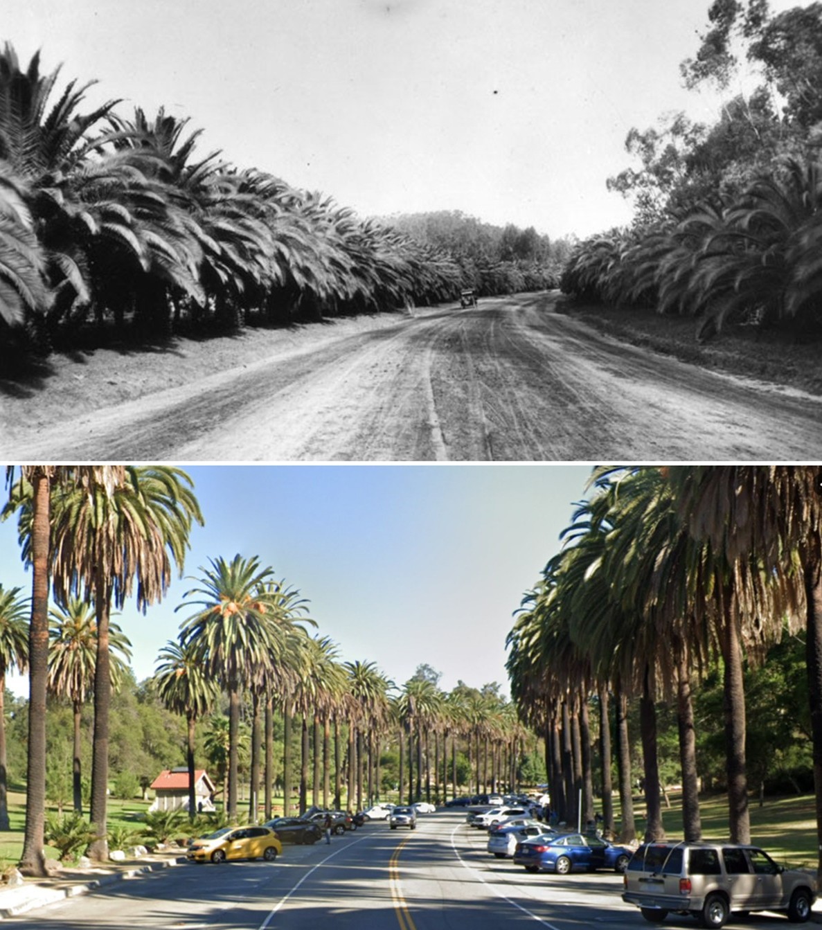 This pattern — durable infrastructure, cycling architecture — is characteristic of how Los Angeles developed along its older transit corridors. The street grid and lot sizes were established early and have proven resistant to change, even as the buildings on those lots have been rebuilt multiple times. The then-and-now view makes that continuity visible in a way that either image alone cannot: the boulevard endures; everything built along it changes.