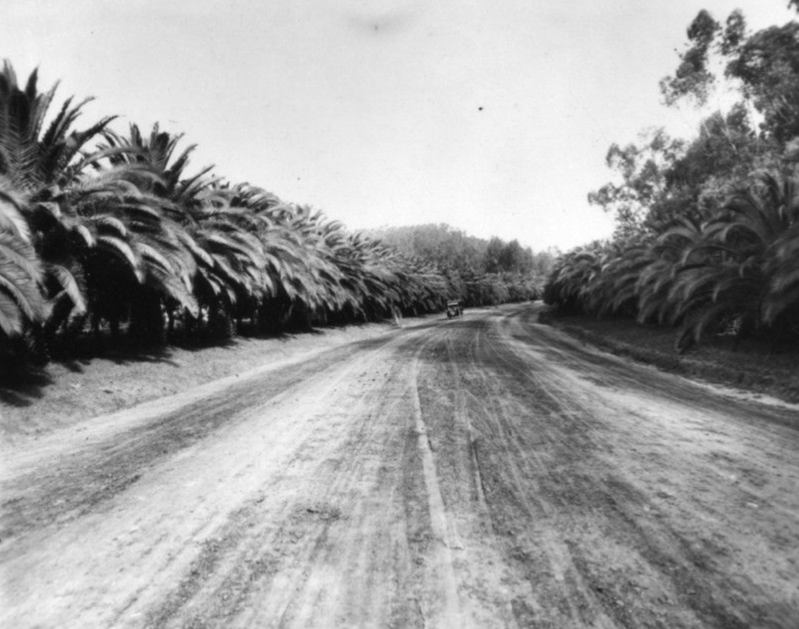 (1904)^ - Automobile parade on Sunset Boulevard. The vehicles are going down the sidewalk past redwood electric poles with palm fronds attached. There are boards stacked to lessen the shock of returning to the road, and the curbs have not yet been cut for driveways.