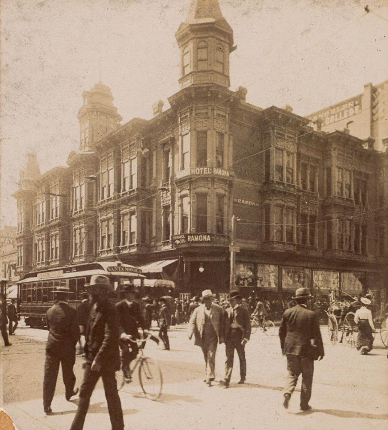 Historical Notes At the turn of the 20th century, the intersection of Spring and 3rd Streets was one of the busiest places in downtown Los Angeles. Horse drawn wagons, electric streetcars, bicycles, and pedestrians all competed for space in the unpaved street. Spring Street was the city’s main business corridor, lined with hotels, banks, shops, and offices. Streetcars ran down the center of the road, moving people between downtown and the growing neighborhoods to the west and south, while horses still handled much of the city’s freight and daily transport. The Hotel Ramona stood prominently on the southwest corner and was one of the city’s best known early hotels. Built in the late 1880s, it featured an ornate Victorian design with corner towers, decorative cornices, tall narrow windows, and a commanding presence at the intersection. The hotel catered to traveling businessmen, tourists, and new arrivals drawn to Los Angeles during its rapid growth years. Its ground floor housed shops and services, while upper floors offered rooms with views of the busy streets below. The Hotel Ramona symbolized the optimism and ambition of early Los Angeles before it was later replaced as downtown development moved south and west. |
