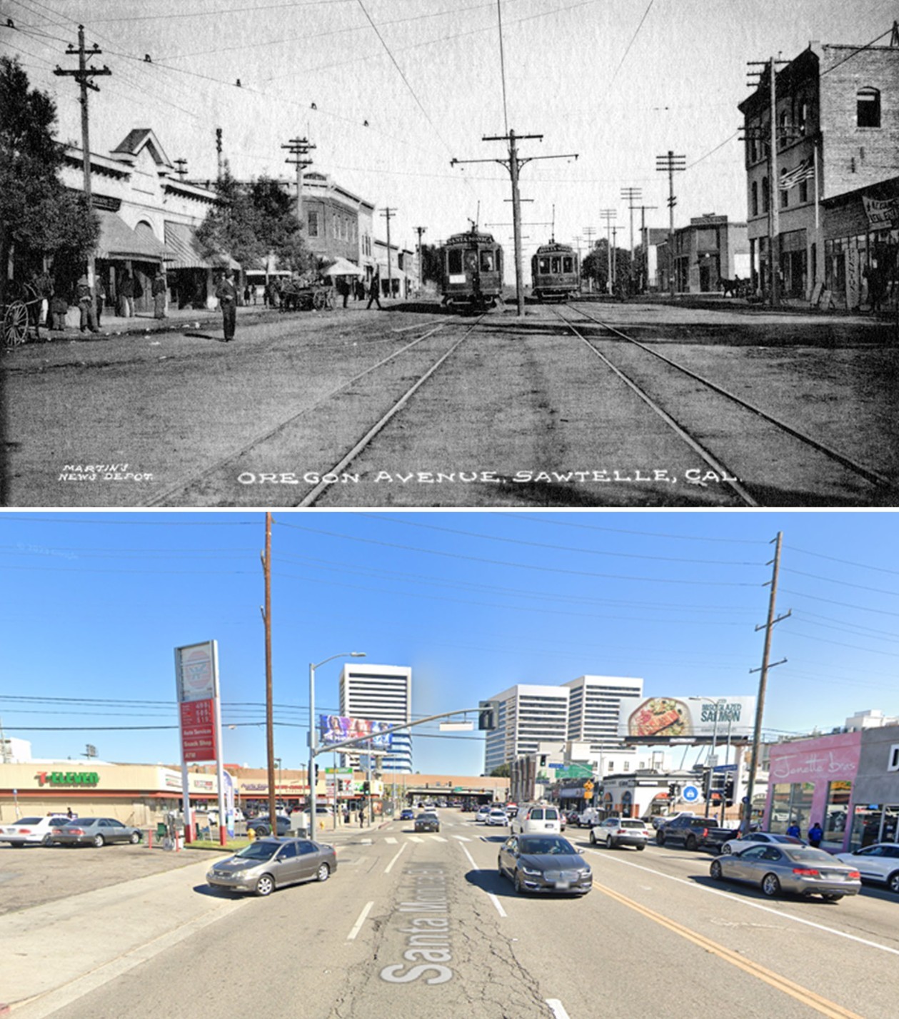 The comparison shows continuity in alignment but turnover in buildings. While most early storefronts have been replaced, the line of the boulevard, the angle of cross streets, and the commercial rhythm—small lots, frequent corners—persist. It’s a visual summary of Los Angeles: infrastructure endures; architecture cycles.