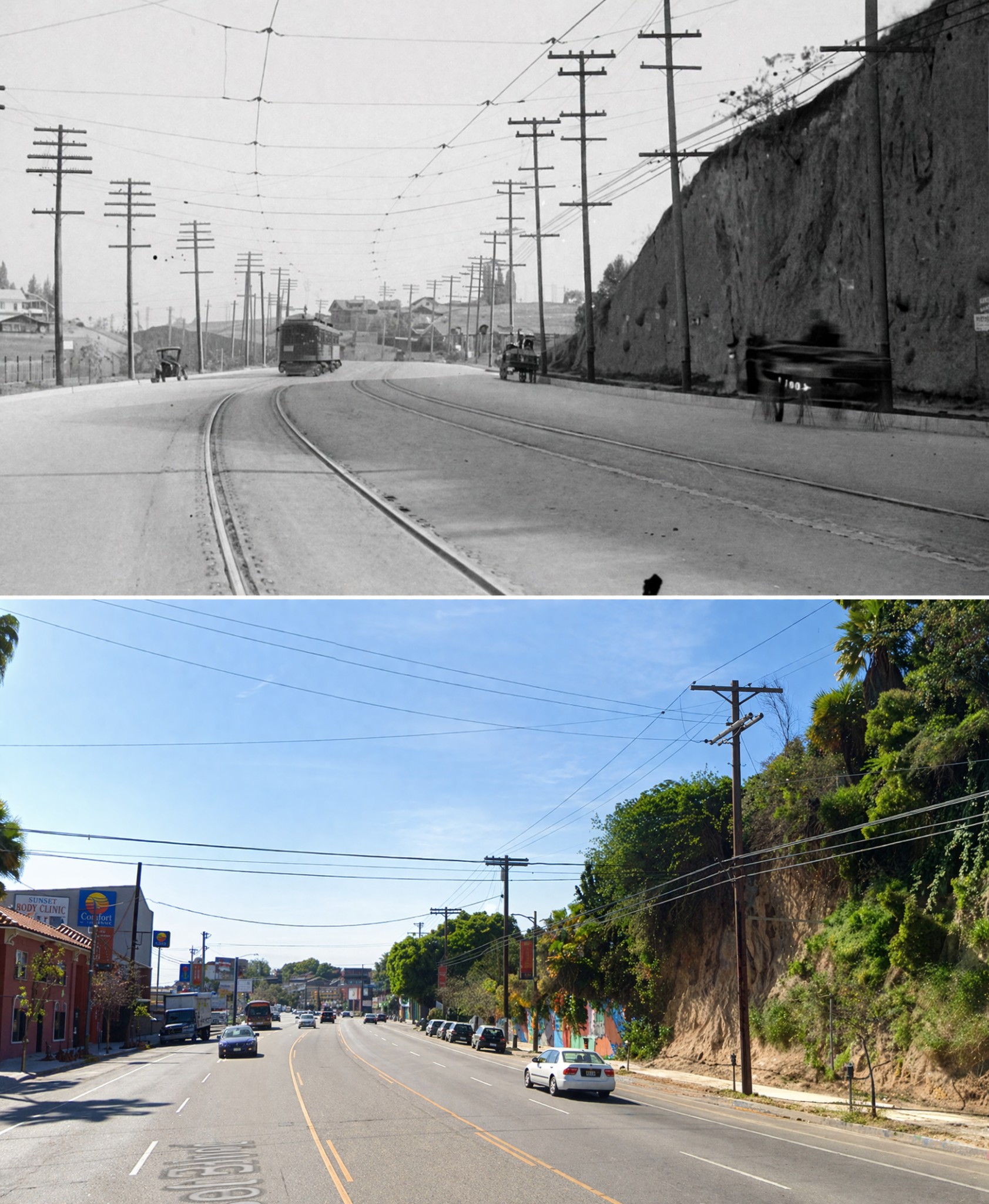 (1912 vs 2019)* - Looking east on Sunset Boulevard from near Occidental Boulevard (about 2751 Sunset Boulevard). Photo comparison by Jack Feldman.