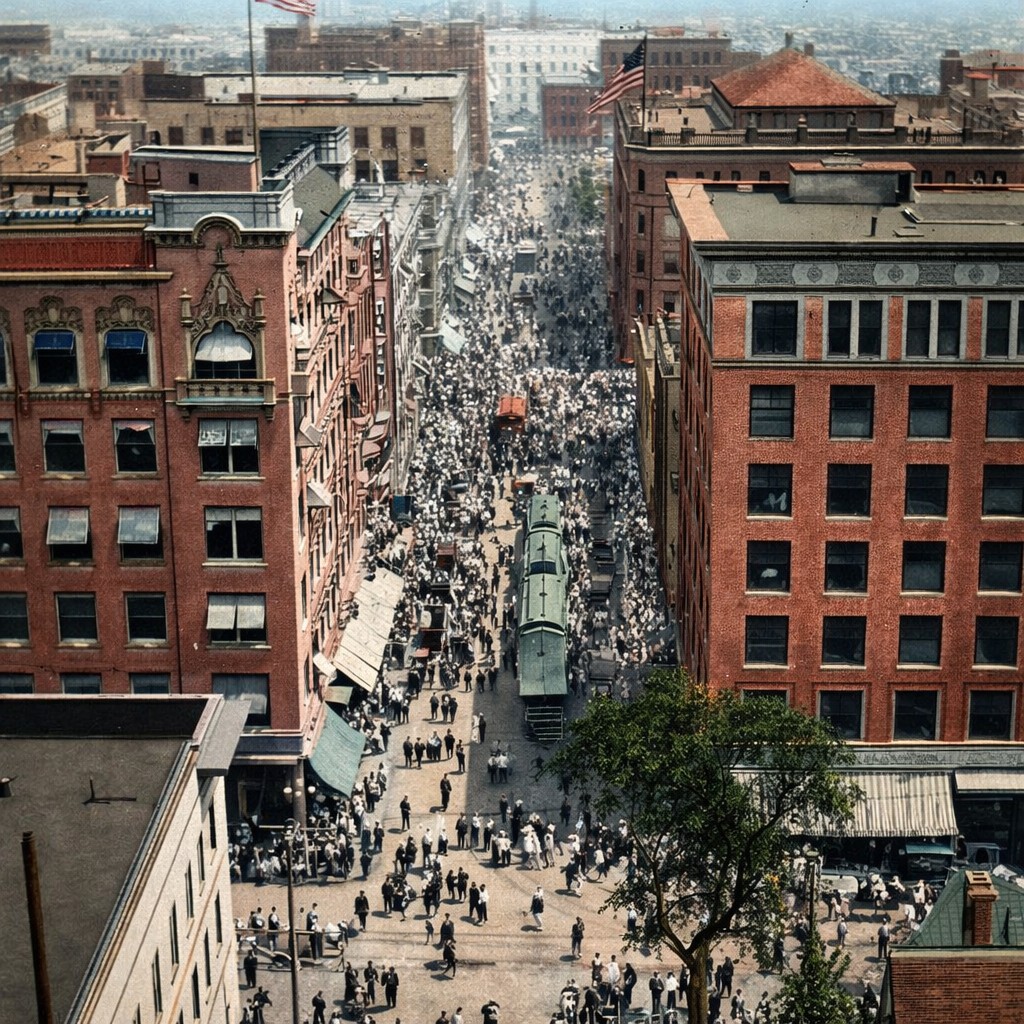 Historical Notes In downtown Los Angeles around 1900, pedestrians followed a formal dress code reflecting the era's social norms. Men typically wore suits with jackets, waistcoats, and trousers, complemented by white collared shirts and neckties or bow ties. Headwear was common, with styles like bowler hats, fedoras, and straw boaters. Women wore long dresses or skirts that reached the ankles, paired with high-necked blouses and corsets to achieve the fashionable silhouette. Their outfits were often topped with wide-brimmed hats adorned with feathers or flowers, along with gloves. The color palette leaned towards dark or muted tones. |
