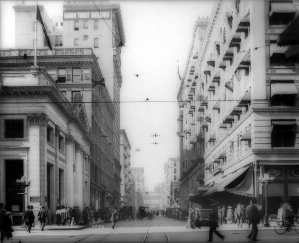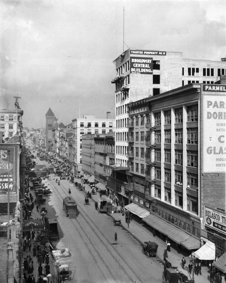 Historical Notes Some of the historical buildings pictured in this photograph are, on the left: Smith's Hotel, which was replaced in 1921 by the Loew's State Theatre; Platt Music Co., built in 1927; Ville de Paris Department Store, founded in 1850 in San Francisco by the Verdier brothers, immigrants from France. This store branch was built in 1916 by architects William J. Dodd & William Richards; and at the far left is the John Brockman Building, built in 1911 by Barnett, Haynes & Barnett, it was one of the first reinforced concrete and steel buildings, and with 12 stories, it was also one of the tallest in Los Angeles. And pictured on the right side: B.H. Dyas Co. Department Store with an American flag hanging from the building. This sporting and dry goods store took over the original Ville de Paris Department Store. Looking down at street-level, numerous cars, trolleys, and pedestrians can be seen bustling along.* |