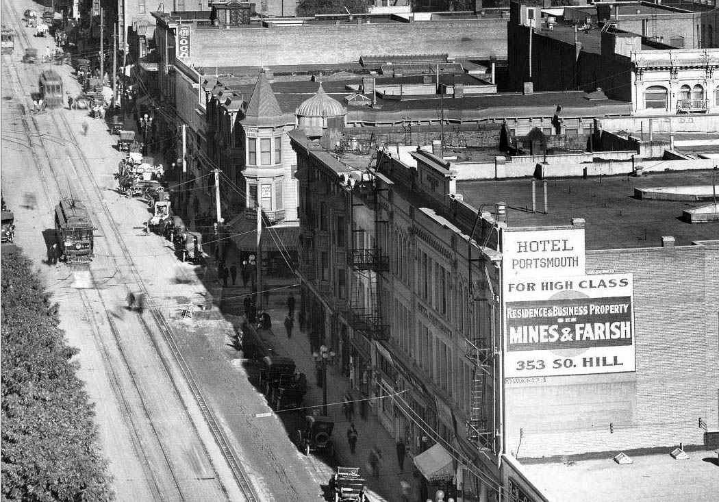 Historical Notes The large billboard at the top advertises 'The Hub,' a prominent clothing store located at 154-200 N. Spring St. within the Bullard Block. The Rosslyn Hotel, at Main and 5th in downtown Los Angeles, was a major early 20th-century landmark developed by the Hart brothers. Opened in 1914 with 750 rooms, it expanded in 1923 with an annex connected by an underground tunnel. Designed by Parkinson & Bergstrom for $1.25 million, it was known as the finest "popular-priced" hotel in the West. A hub for social events, it closed in 1959 and later became loft residences. Click HERE to see more. |