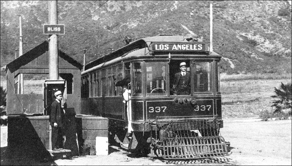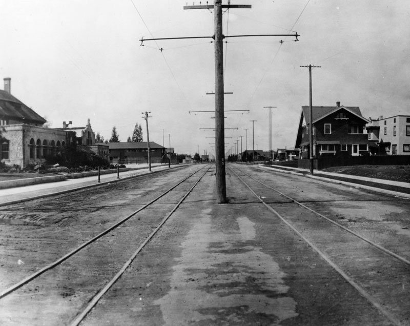 Historical Notes This photo shows the earlier double track type; later cars ran single track, "toonerville trolleys." The Bessolo residence is in the background. The construction of Henry Huntington's Los Angeles Railway trolley line up Eagle Rock Boulevard to Colorado Boulevard and on Colorado to Townsend Avenue commenced the rapid suburbanization of the Eagle Rock Valley. |