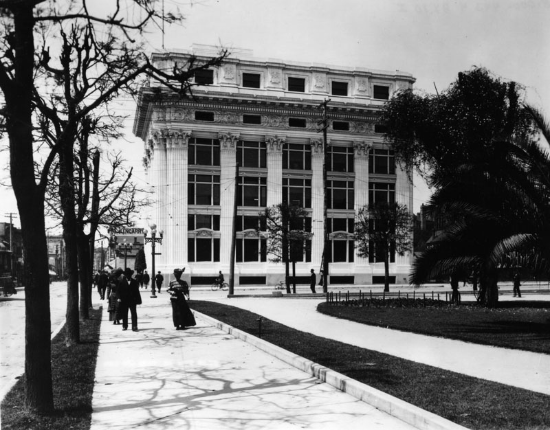 Historical Notes Designed in the Classical Revival style, the Farmers and Merchants Bank remains one of Southern California's finest examples of the early "temples of finance" which were popular at the turn of the century. Its two-story facade, reminiscent of a Roman temple, is punctuated by an entrance framed with Corinthian columns topped by a large triangular pediment. Built in 1905, the bank was designed by the firm of Morgan and Walls. The Farmers and Merchants Bank was the first incorporated bank in Los Angeles, founded in 1871 by John G Downey, the seventh governor of California and Isaias W. Hellman, a successful merchant, real estate speculator and banker, and brother of Hermann W. Hellman. Downey was named the first president. Isaias later served as president of the bank till his death in 1920.*^ |