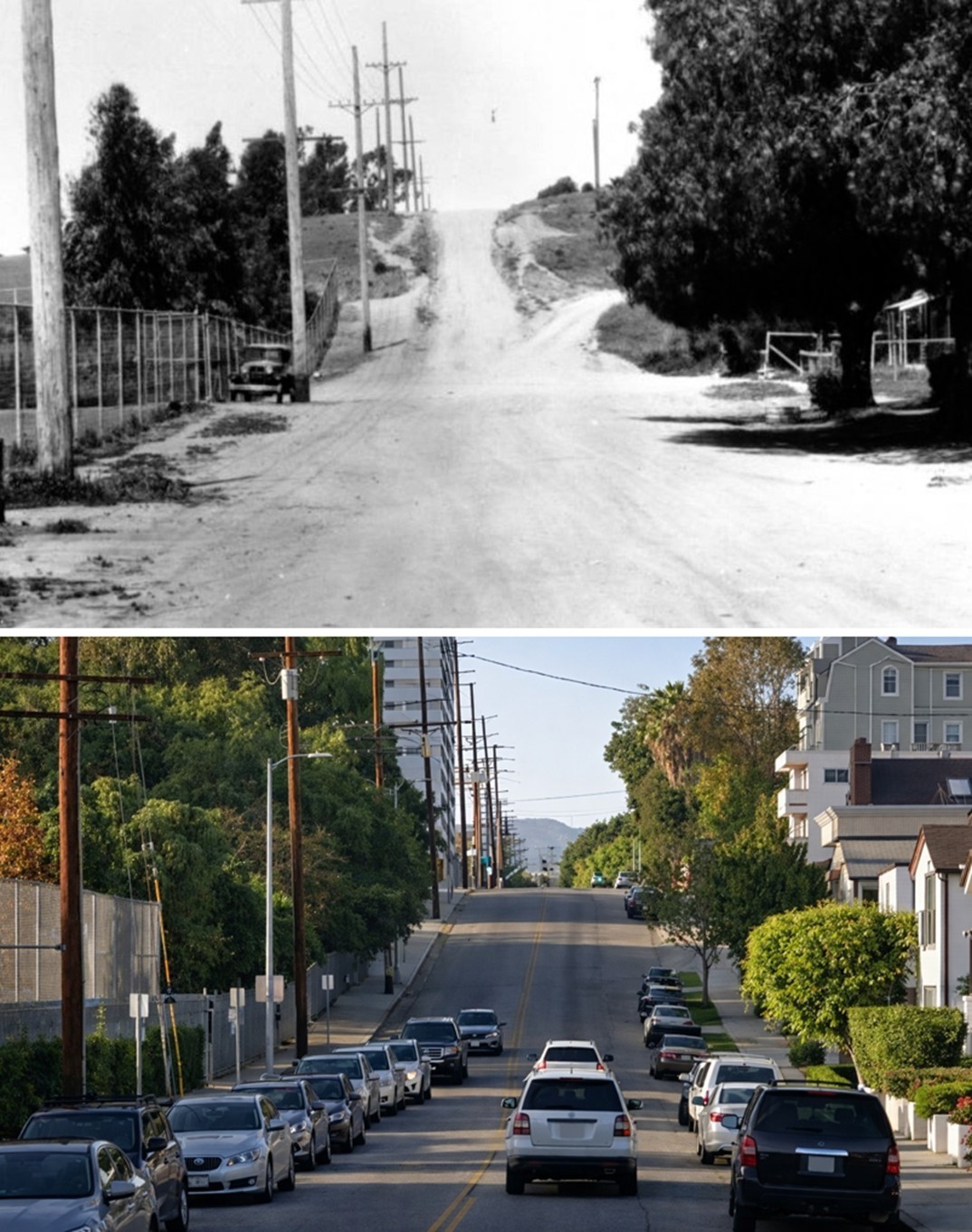 | (1934 vs. 2021) – Looking north on Barrington Avenue from near Ohio Avenue. |