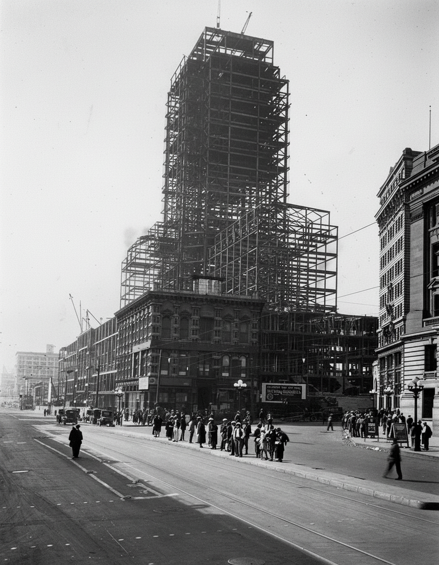 | (ca. 1939)* - Looking up from Market Street at the ornate United States Hotel, with the Los Angeles City Hall rising tall in the background across Main Street. |