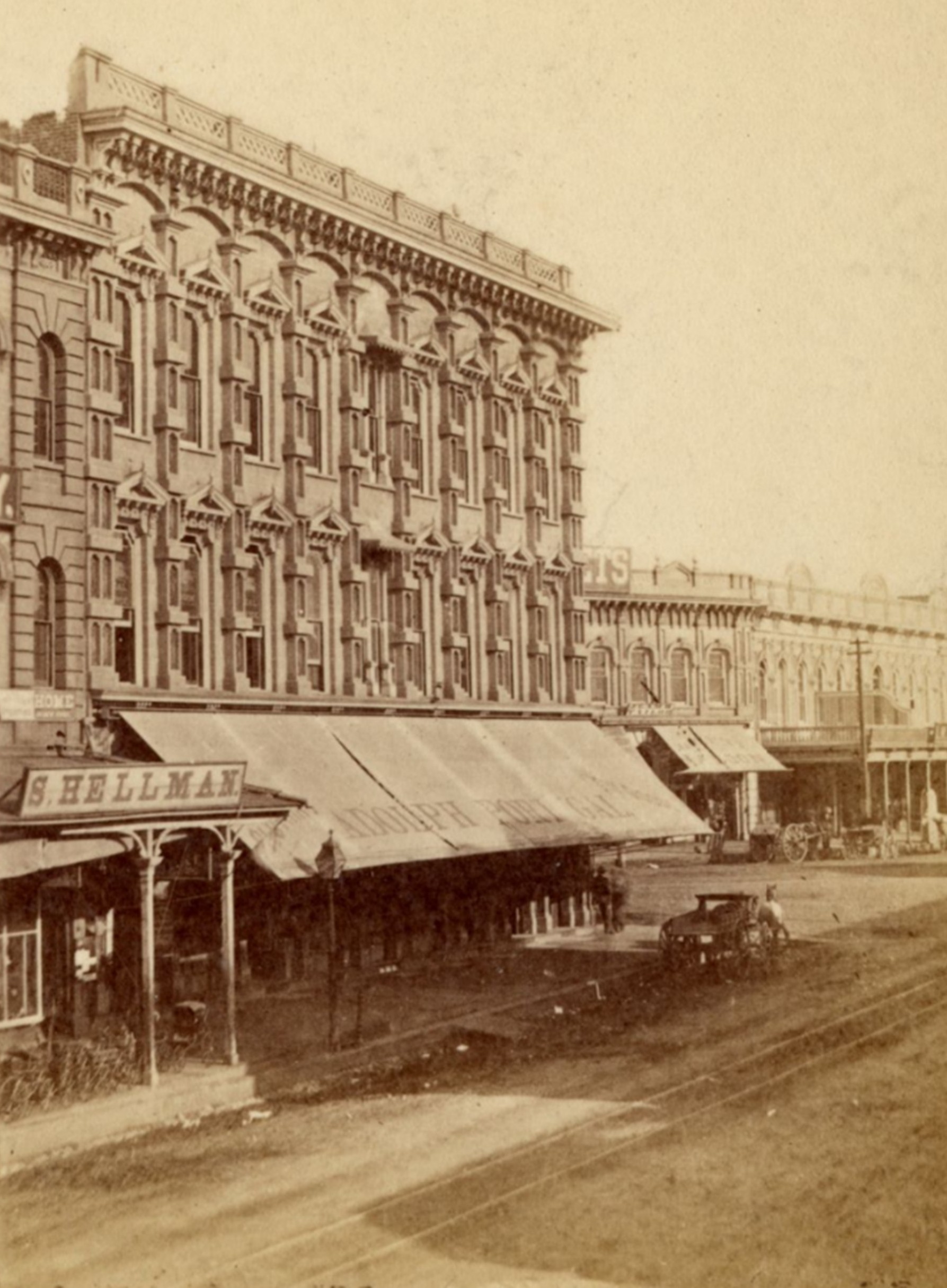Historical Notes The U.S. Hotel, located on the southeast corner of Main Street and Market Street (originally known as Requena Street), was built in an ornate Italianate architectural style. The hotel, constructed in 1862 and demolished in 1939, was notable for its elaborate design featuring ‘a profusion of brackets, corbel tables, and oriel windows’. |