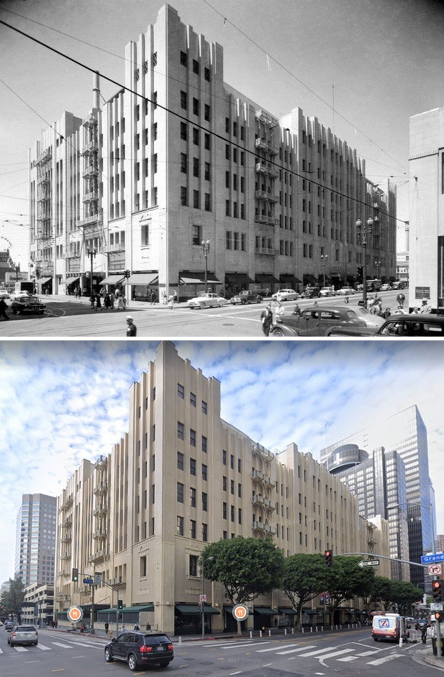 Historical Notes This then and now comparison shows how dramatically the Temple and Spring streets area has changed over time. In 1929, the International Bank Building stood prominently along Temple Street, just before it was overshadowed by the newly completed Los Angeles City Hall. By 2021, the bank building was long gone, having been demolished in 1954 as part of Civic Center redevelopment. What was once a dense mix of commercial and civic buildings is now a more open streetscape focused on government offices, reflecting the city’s continued growth and changing priorities. |