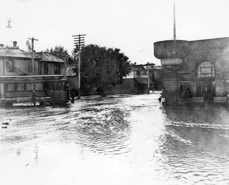 | (1890s)* - View of a flooded intersection at 7th Street and Grand Avenue. On the right, two men stay on high ground trying to avoid the rising water. To the left, a cable car appears to be stalled in the middle of the intersection. |