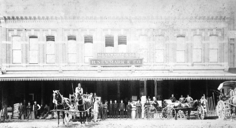| (1886)* - People, horses and buggies lined up in front of H. Newmark & Co. in the Amestoy Block in 1886. |