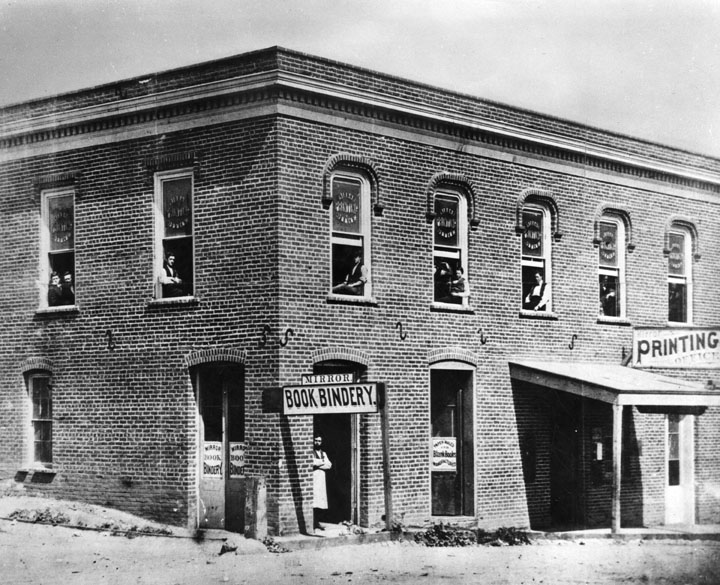 | (ca. 1905)* - North side of 1st Street with the three-story Times Building. Signs for “Furnished Rooms,” “The Ark,” and “The American Café” are visible next door. |