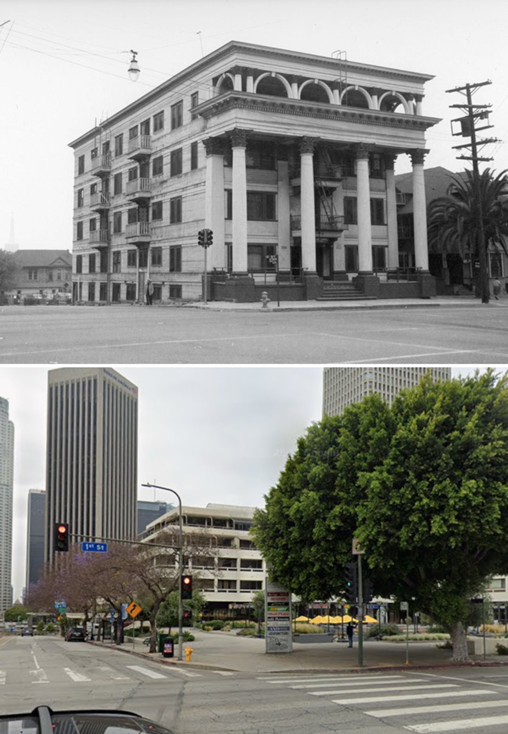 (1955 vs. 2024)* – Looking at the southwest corner of Hope and 1st Streets. The Lima Apartments Hotel once stood here; today the site is the Promenade Plaza in front of the Promenade Residences building. |