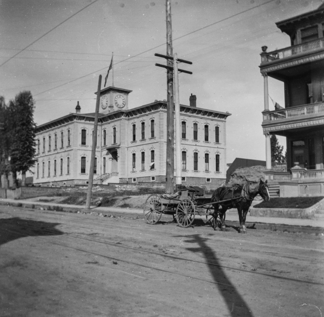 Historical Notes The new Los Angeles High School (seen behind the Plaza Church) replaced the original 1872 structure that once stood atop Poundcake Hill. The new campus atop Fort Moore Hill was completed in 1891, and Los Angeles High School moved in. It was an imposing building for its time, constructed partly on the former site of Fort Moore Hill Cemetery—the first Protestant cemetery in Los Angeles. One of the school’s mottos, “Always a hill, always a tower, always a timepiece,” reflected its proud, elevated setting. |