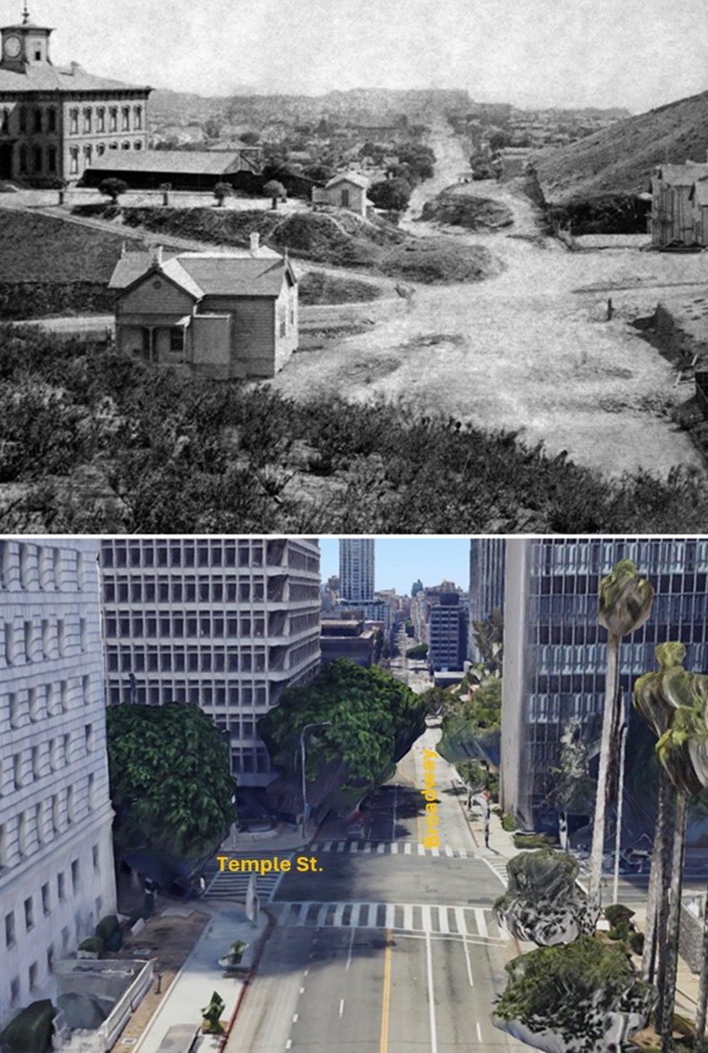 Historical Notes Nearly a century separates these views, yet much of the historic Plaza area endures. The Pico House, Plaza Church, and adjacent 19th-century commercial buildings remain intact, while City Hall continues to dominate the skyline. Additions such as the Federal Courthouse (1940) and City Hall East (1969) reflect the city’s mid-century civic expansion. Together, they chart Los Angeles’ evolution from a compact pueblo to a sprawling metropolis. |