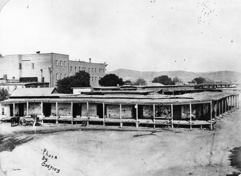 | (1873)*#^ - The Pico House, and to its right, Merced Theater and Masonic Lodge as seen from Fort Moore Hill. Note the streetcar tracks running down the middle of Main Street. Also, to the left, a fragment of the Plaza, and the adobe structures which stand south of the Lugo Adobe on what is now Los Angeles Street, then Calle de los Negros. The LA River can be seen in the background. |