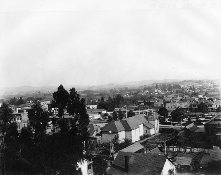 | Panoramic view of the Los Angeles Plaza as it appeared 1876. The Pico House is the prominent 3-story white building at the center of the photo. The back of the Old Plaza Church is in the lower-center left with Los Angeles River seen in the distance.* |