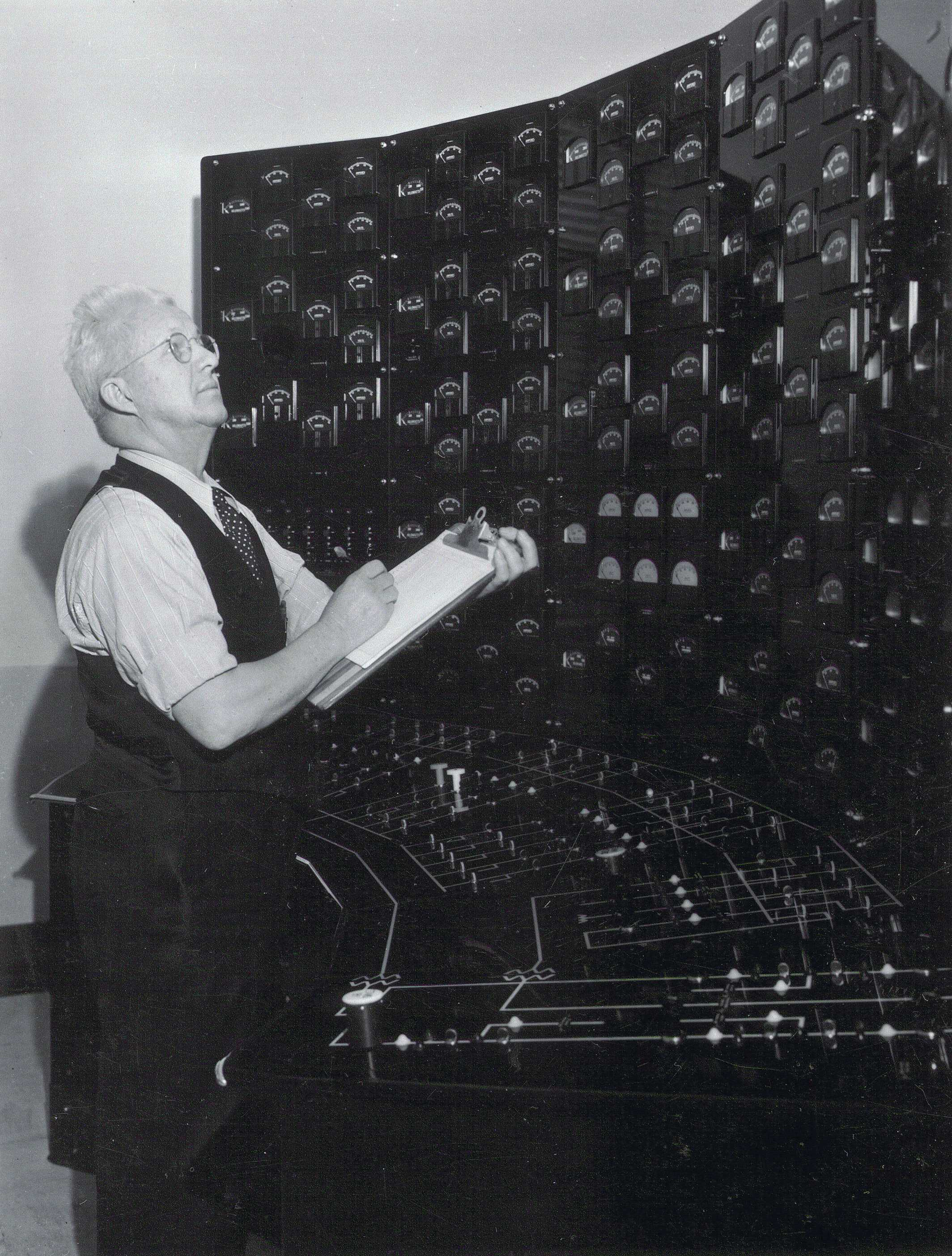 | (ca. 1930s)^^ - Senior Operator J. M. Stetzer at the control board, DS-23. |