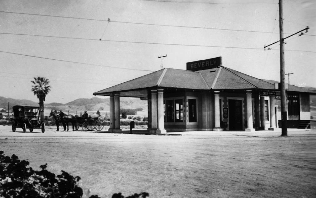 | (ca. 1910)* - Before being incorporated, before the Beverly Hills Hotel, before there was even "Hills," it was called just "Beverly." The above view shows Beverly Hill’s first train station located where the historic post office still stands on the southeast corner of Santa Monica Boulevard and Cañon Drive. |