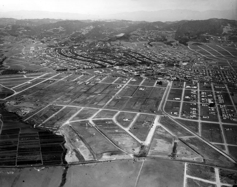| (1922)* – Aerial view of Beverly Hills north of Wilshire Boulevard. A thin line of trees is pictured in the left foreground, cutting diagonally down across an expanse of what appear to be cultivated fields. In the center ground at left, a collection of three straight roads separates four sections of residential property. These roads continue farther into the background where they become part of a group of snaking, s-shaped roads. |