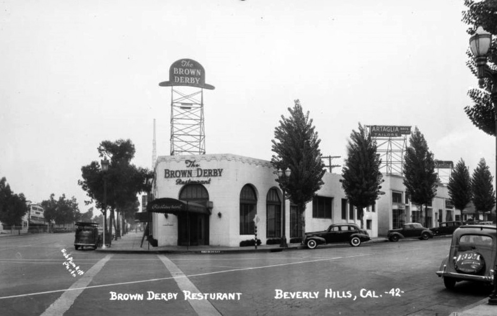 | (1942)* – Postcard view showing Brown Derby Restaurant with its distinctive hat-shaped rooftop sign, located on the northwest corner of Wilshire Boulevard and Rodeo Drive. Several 1940s-era automobiles are parked along the street. Photograph by Bob Plunkett, from the Ernest Marquez Collection. |