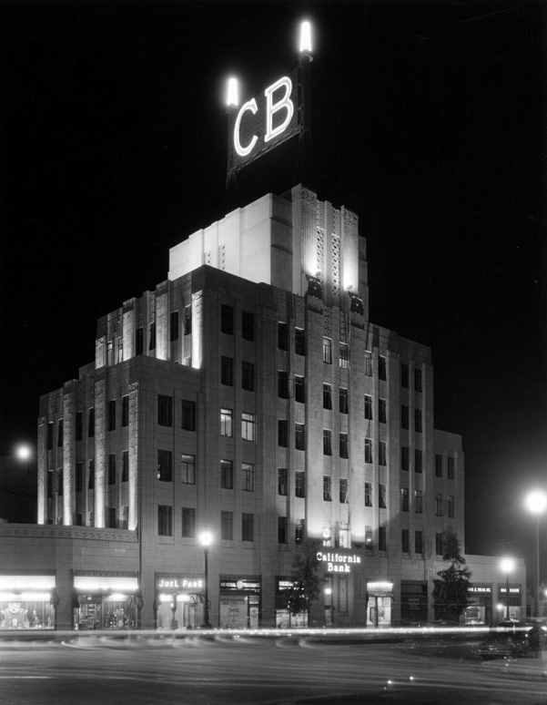 | (1930)* - Night view of the California Bank Building located at 9441 Wilshire Boulevard in Beverly Hills. Click HERE to see contemporary view. |