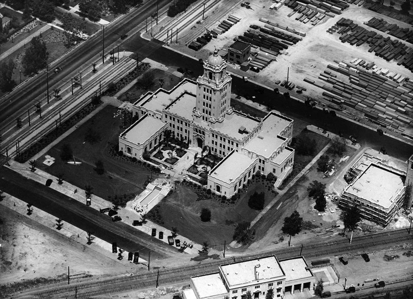 | (ca. 1918)* - View looking north showing Sunset Park (later Will Rogers Memorial Park) in front of the Beverly Hills Hotel, designed by Elmer Grey. Neither has mature landscaping at this time. Note the streetcar on Sunset Boulevard (center-left). |