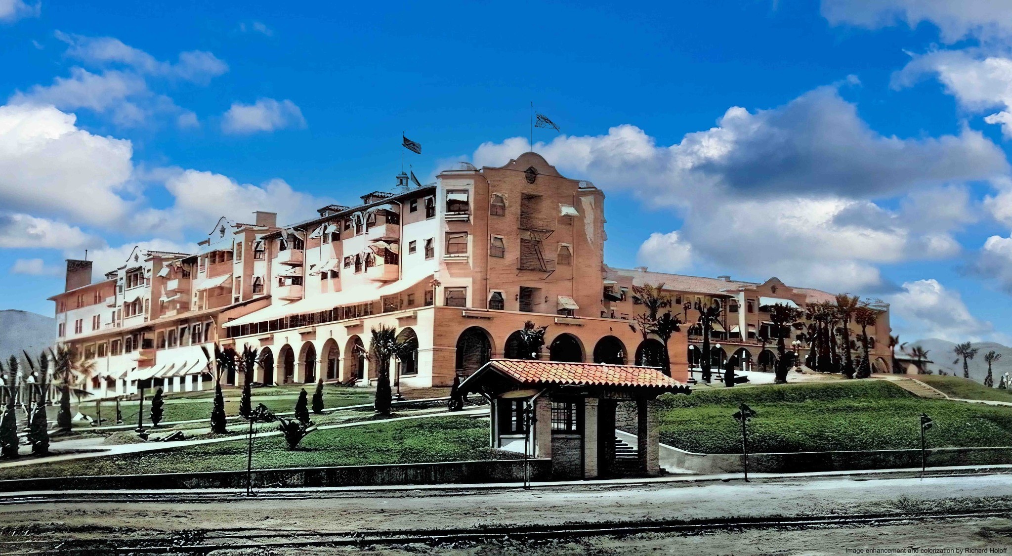 | (ca. 1918)* - Close-up view of the Beverly Hills Hotel with Pacific Electric station on Sunset Boulevard in the foreground. Image enhancement and colorization by Richard Holoff. |