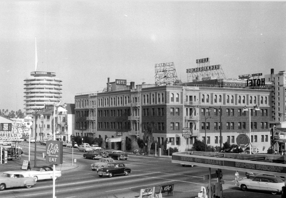 | ca. 1940s)* - Postcard view showing the Knickerbocker Hotel, located at 1714 N. Ivar Avenue. The Guaranty Building stands to the right of the Knickerbocker Hotel on the NE corner of Hollywood and Ivar. |