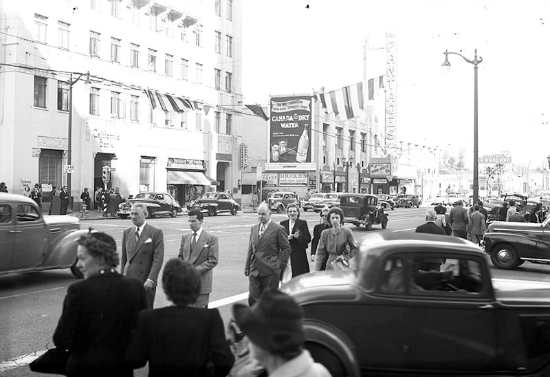 | (1945)* - V-J Day celebration on Hollywood Boulevard east of Vine near the Pantages Theatre. |