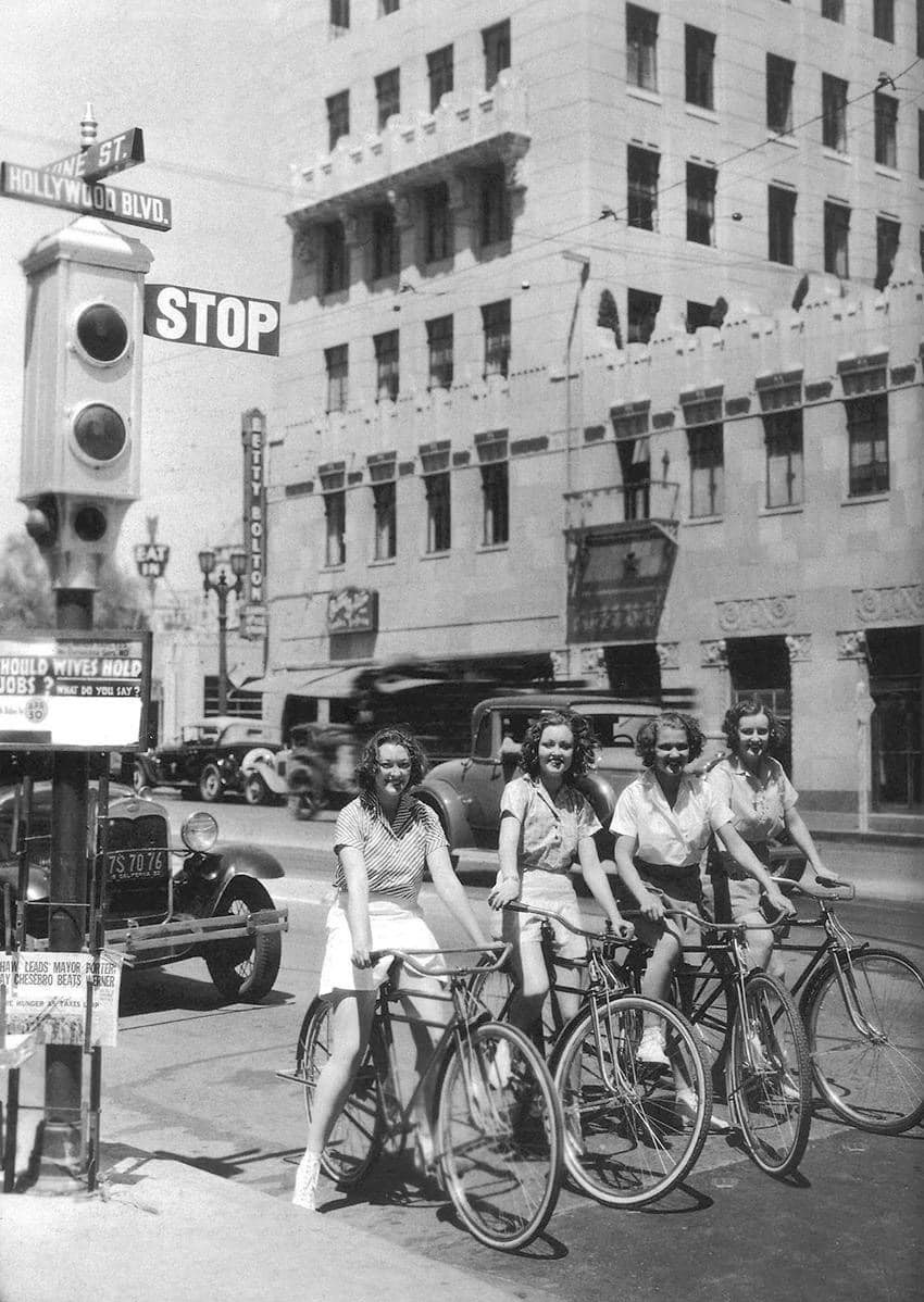 | (1933)* - Girls on bikes at the intersection of Hollywood and Vine with the Equitable Building seen in the background. |
