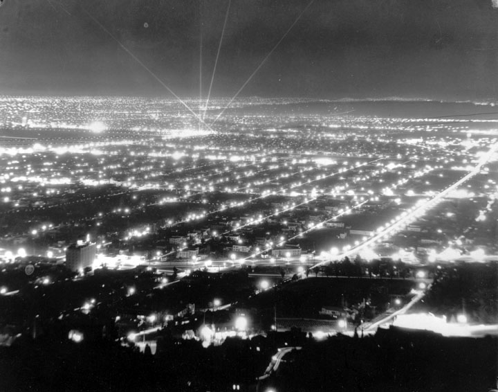 | (ca. 1960s)* – Night view looking north showing the Capitol Records Building with the Hollywood Sign in the background. |