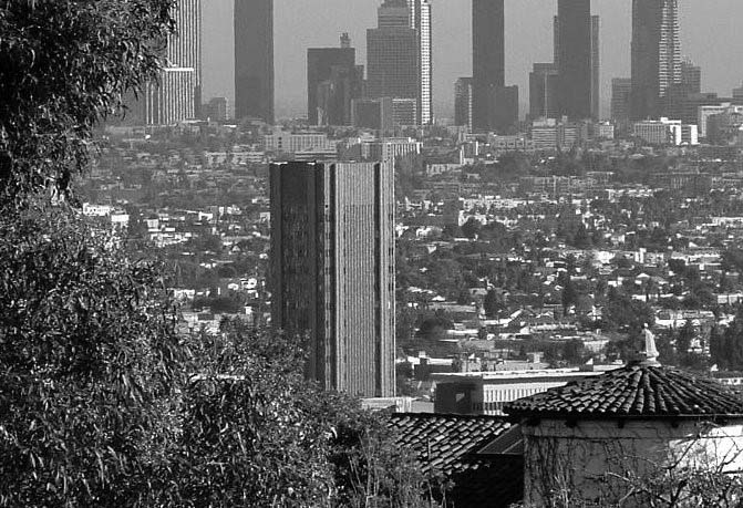 | (n.d.)* – View through a telephoto lens looking southeast from the Hollywood Hills showing the Sunset Vine Tower standing tall in the foreground with the downtown skyline in the distance. |