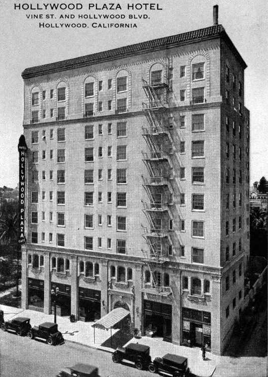 Historical Notes In the 1940s and 1950s when many broadcast studios were located on or near Vine Street the Hollywood Plaza Hotel became popular with radio people. George Burns even had offices at the top of the hotel. The popular radio DJ Johnny Grant did his show from the Hollywood Plaza Bar. Grant also did a radio show from midnight - 4:00 a.m. in the nearby Ham and Eggers Restaurant. |