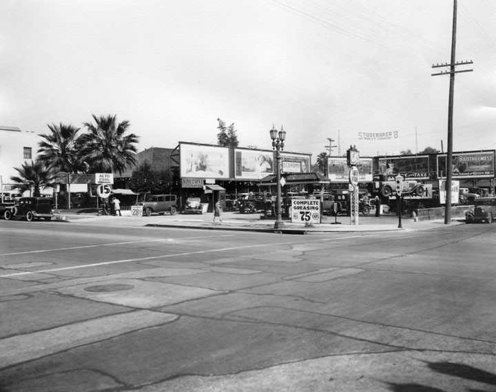 | (1930)* – View looking east showing the junction of Hollywood and Sunset. The marquee of the Vista Theatre (previously the Bard) is visible at top center. |