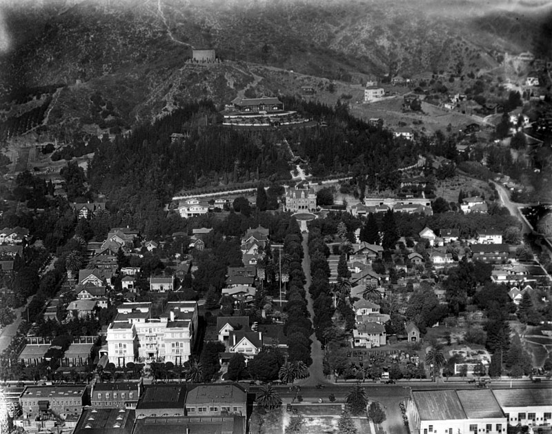| (ca. 1924)* - Aerial view looking north on Orange Drive toward Franklin Avenue. On top of the hill (top-center) sits the Japanese estate and gardens of Charles and Adolph Bernheimer. |