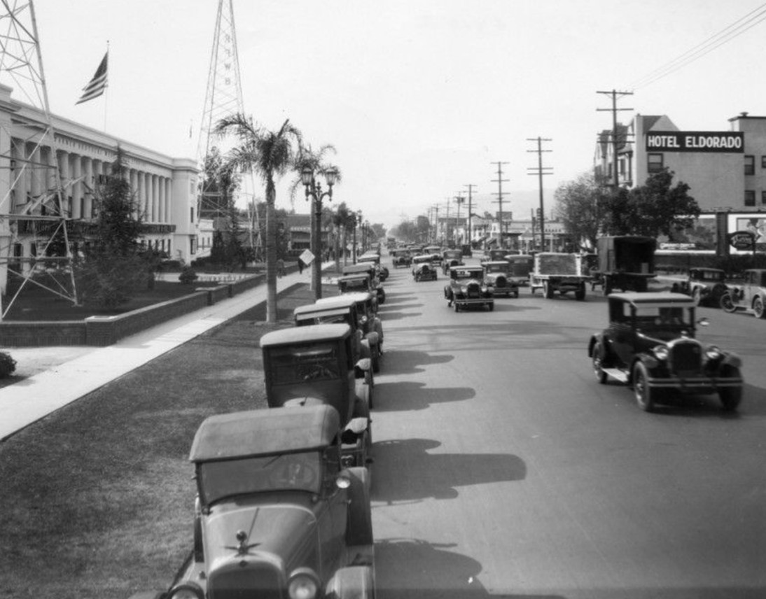 | (ca. 1924)* – Cars parked in front of Grauman’s Egyptian Theatre with the 1922-built Hotel Christie seen in the background. |