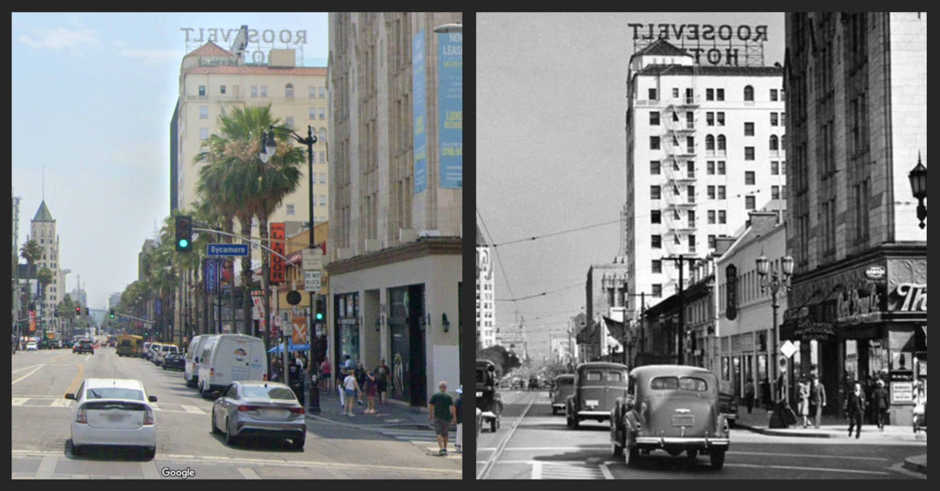 | (1947 vs. 2024)* – Looking north on Vine Street from in front of NBC Radio City, which once stood at the northeast corner of Sunset and Vine—now the site of Home Savings & Loan and its parking lot, just to the right of the contemporary image. Photo comparison by Jack Feldman. |