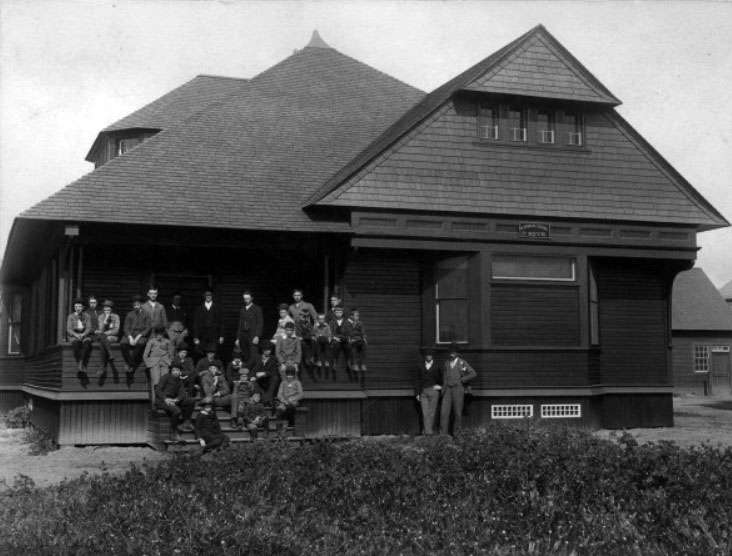 | (1891)** - View of a group of young men in front of the Classical School for Boys, located at 59 S. Euclid Ave. |
