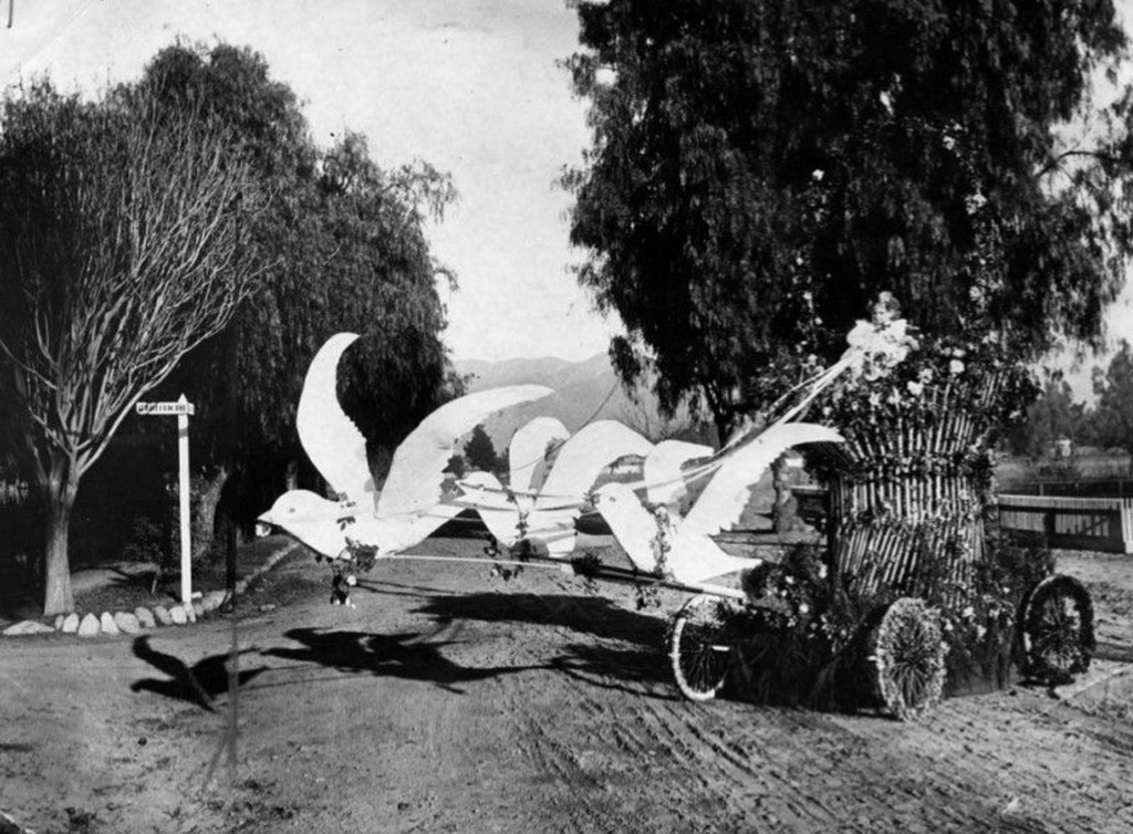 | (ca. 1894)* - Early Rose Parade float bearing the words “1874 Crown of the Valley,” Pasadena’s nickname and founding year. |