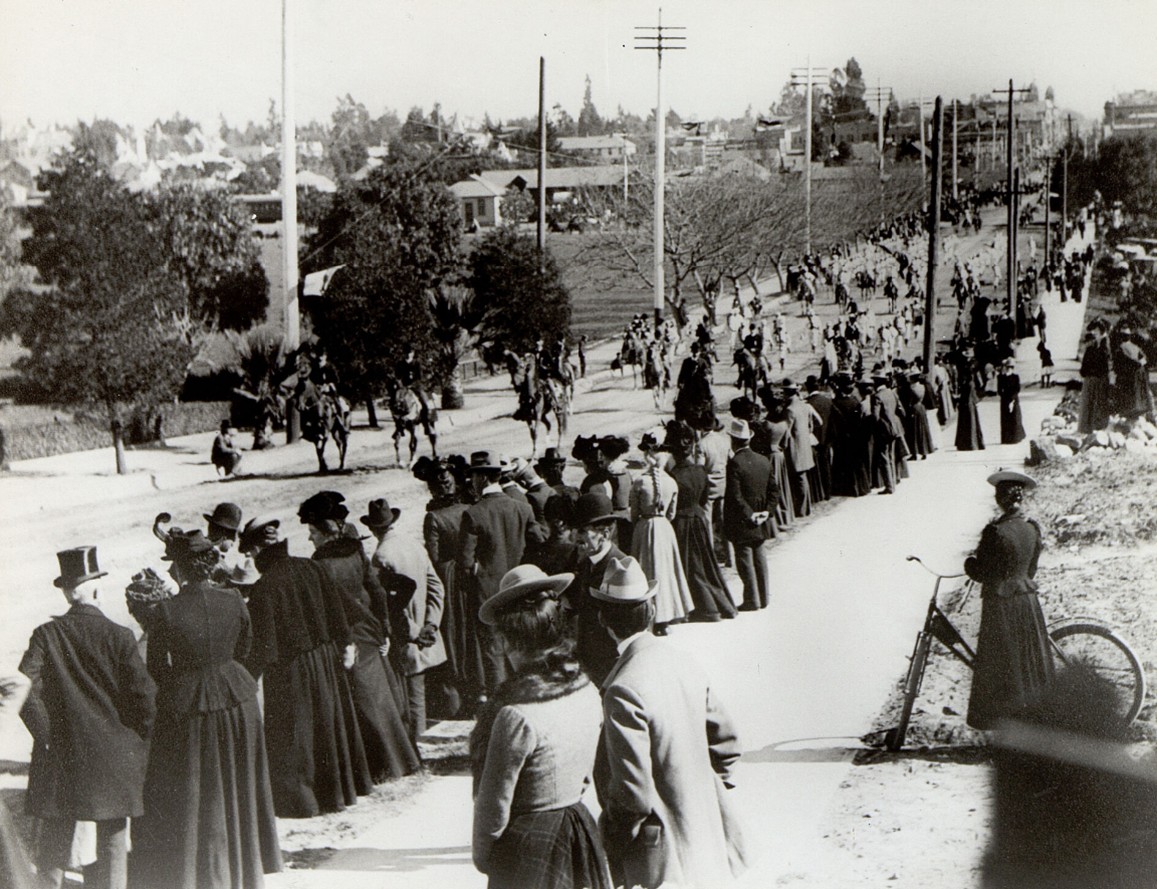 | (1893)* - Spectators line the route at Tournament Park during the Tournament of Roses Parade. California Avenue area, across from the future site of Caltech. |