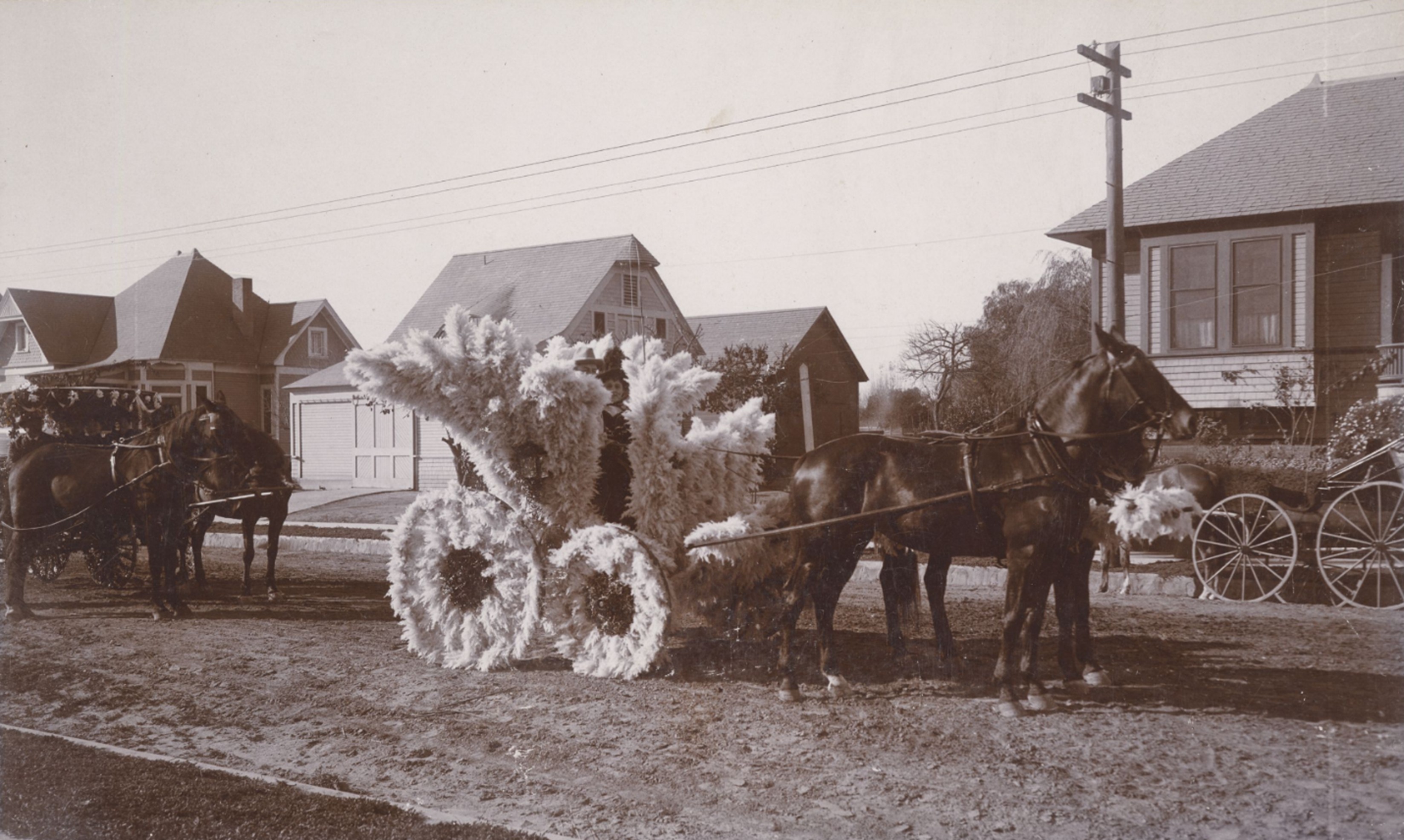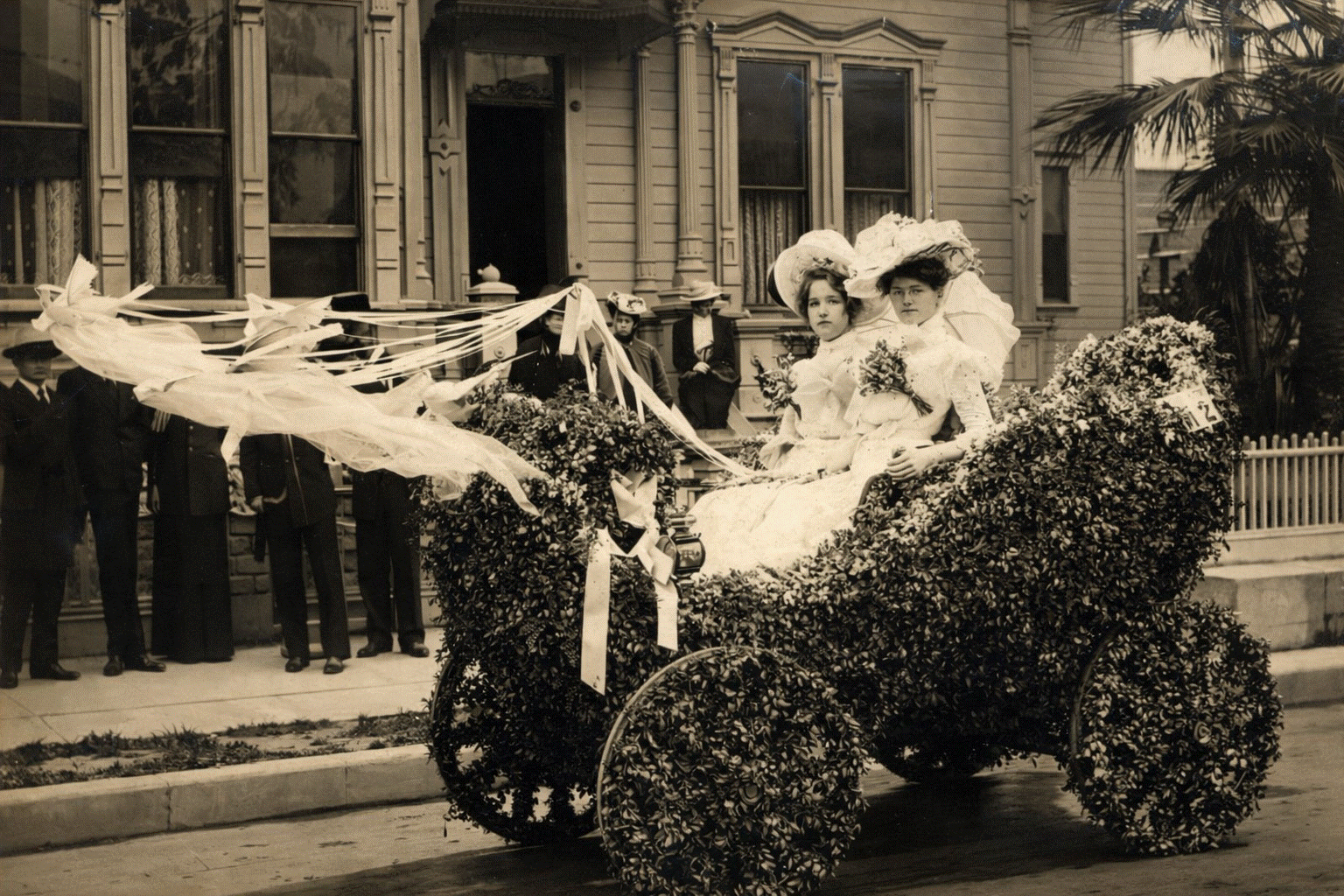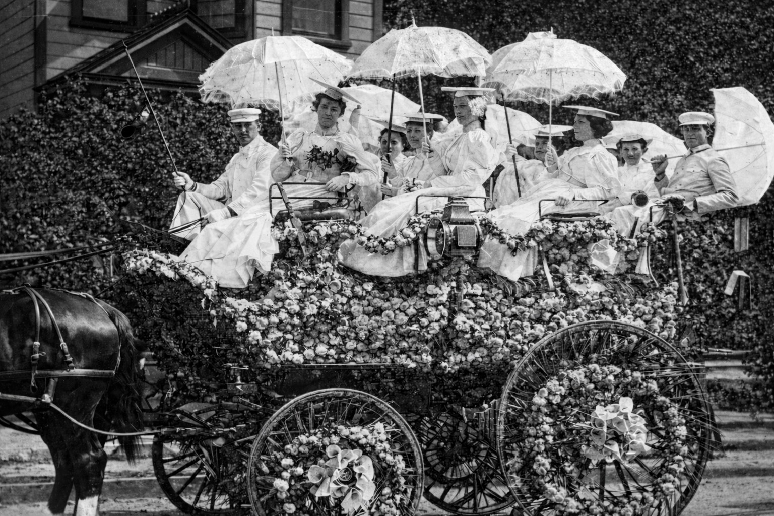 | (1896)* - Horse-drawn carriage packed with riders during the Rose Parade. Women hold parasols as the procession moves along the route. |
