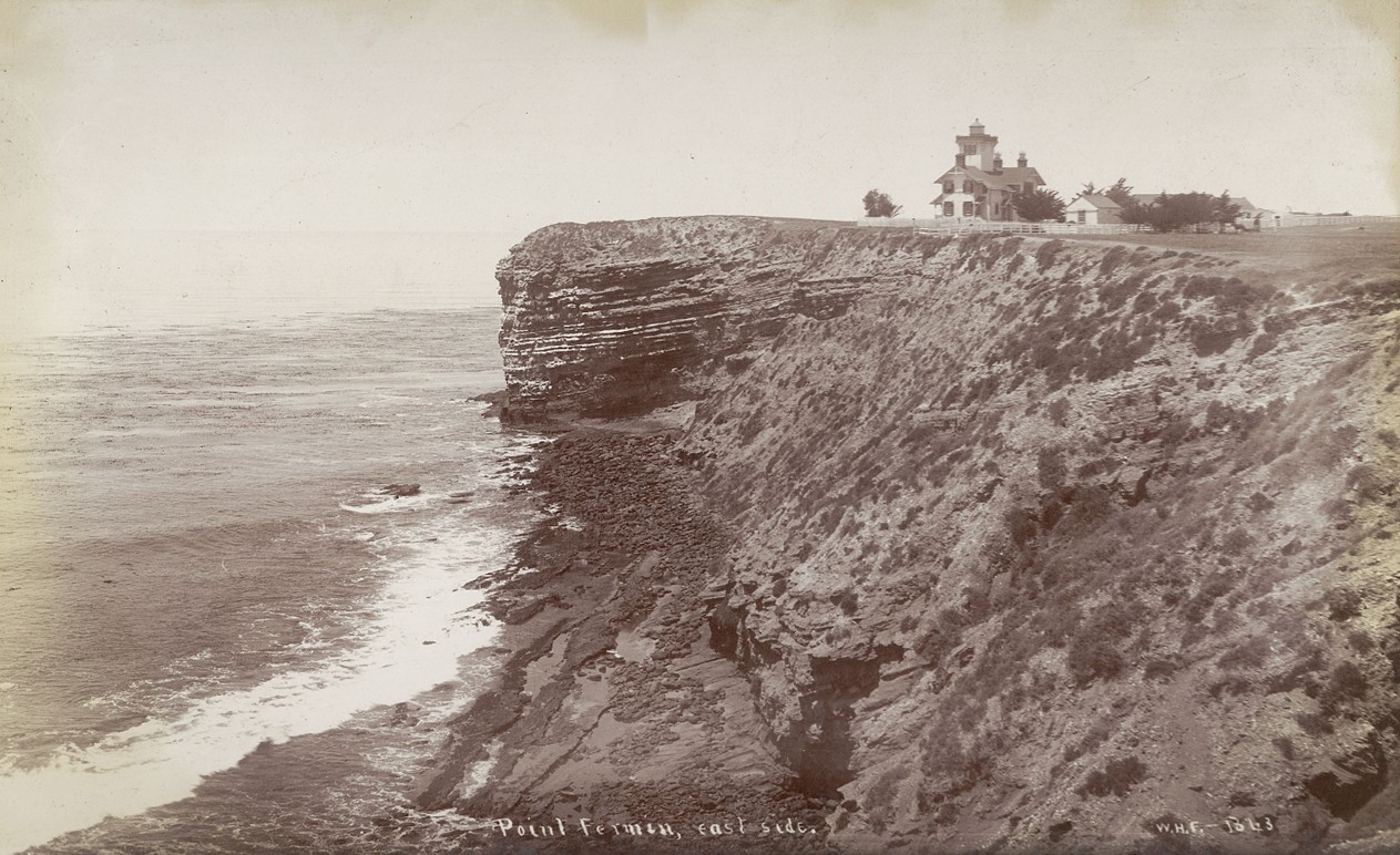 Lumber piles, rail tracks, and shoreline buildings reflect growing industrial activity. Deadman’s Island remains visible in the distance. This period marks the shift from ranch-based land use to transportation and shipping infrastructure. |