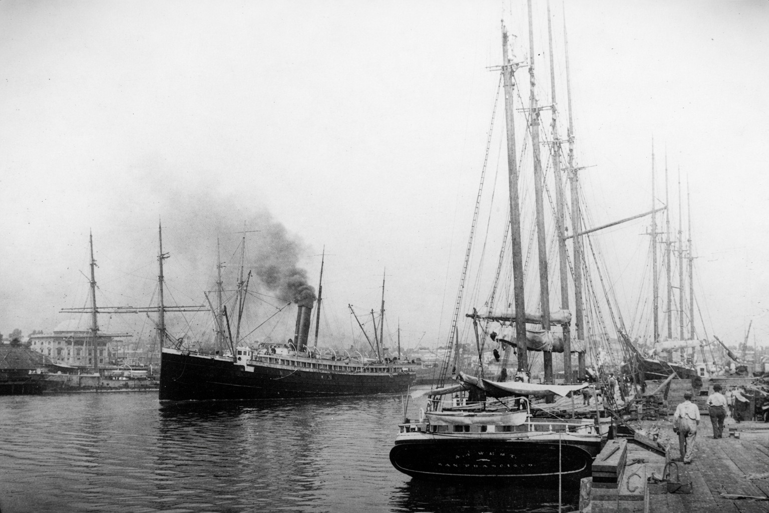 | (1910)* - Steam ferry and sailing freighters in Los Angeles Harbor at San Pedro. The new City Hall is visible in the background at left. |
