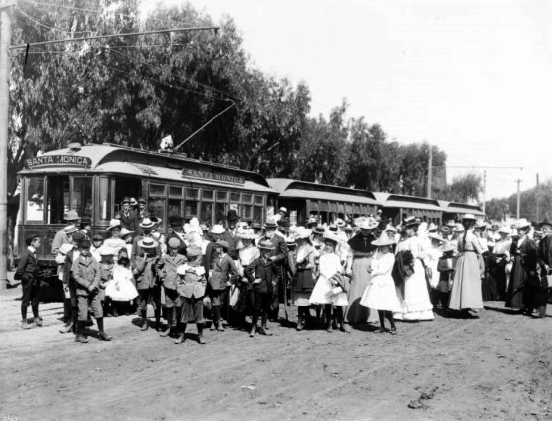 | (1896)* - Opening of the Los Angeles Pacific Electric Railway from Los Angeles to Santa Monica, April 1, 1896. The extensive Pacific Electric Railroad easily transported to the beaches people from across the Greater Los Angeles Area. |