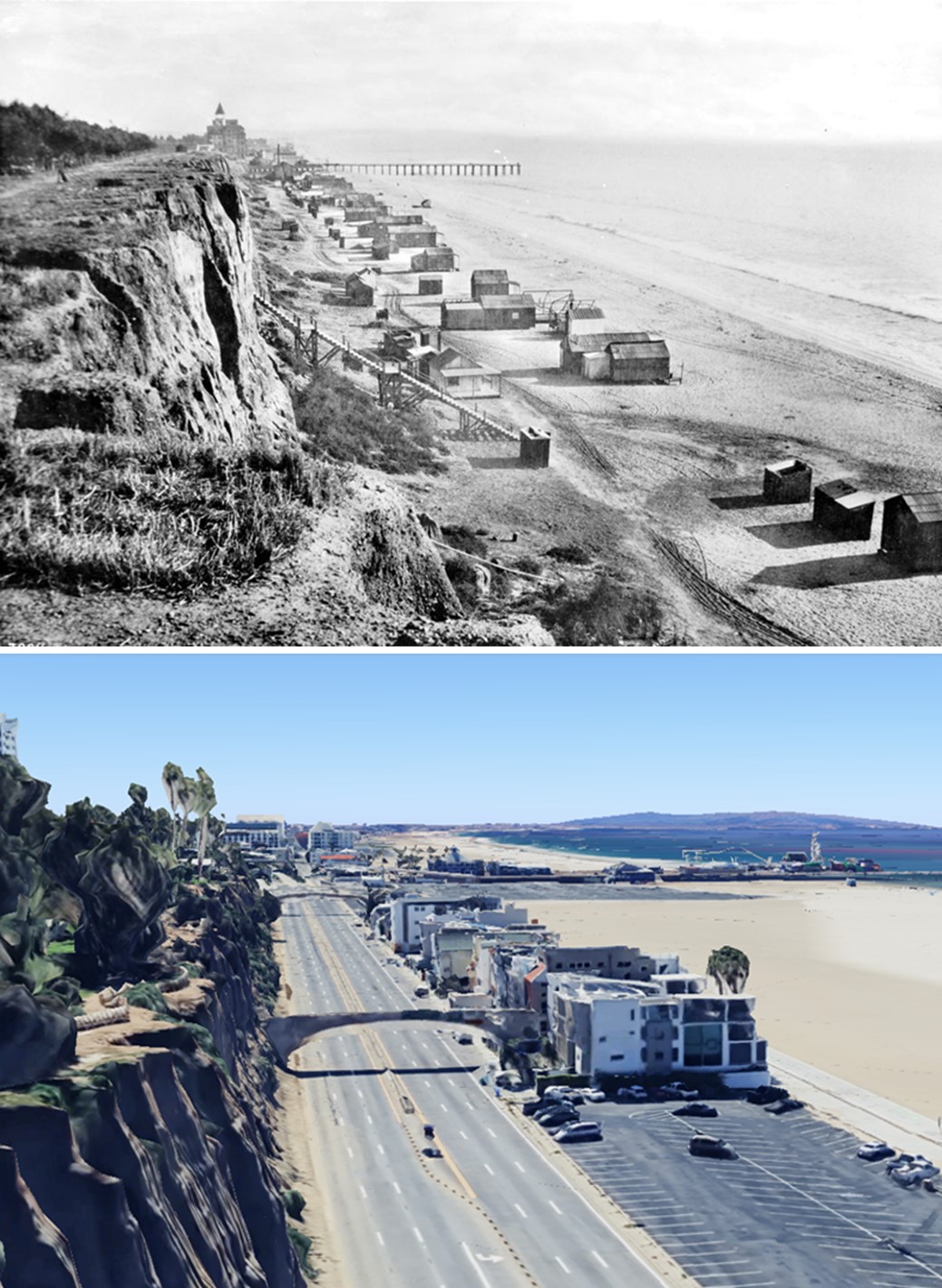 | (1932 vs. 2023)* - Looking north from above Santa Monica Canyon, illustrating how much development has occurred over 90 years. Note that the Pacific Palisades bluffs are no longer vertical; through natural erosion or engineering, they have been slanted to prevent future slides. Photo comparison by Jack Feldman. |
