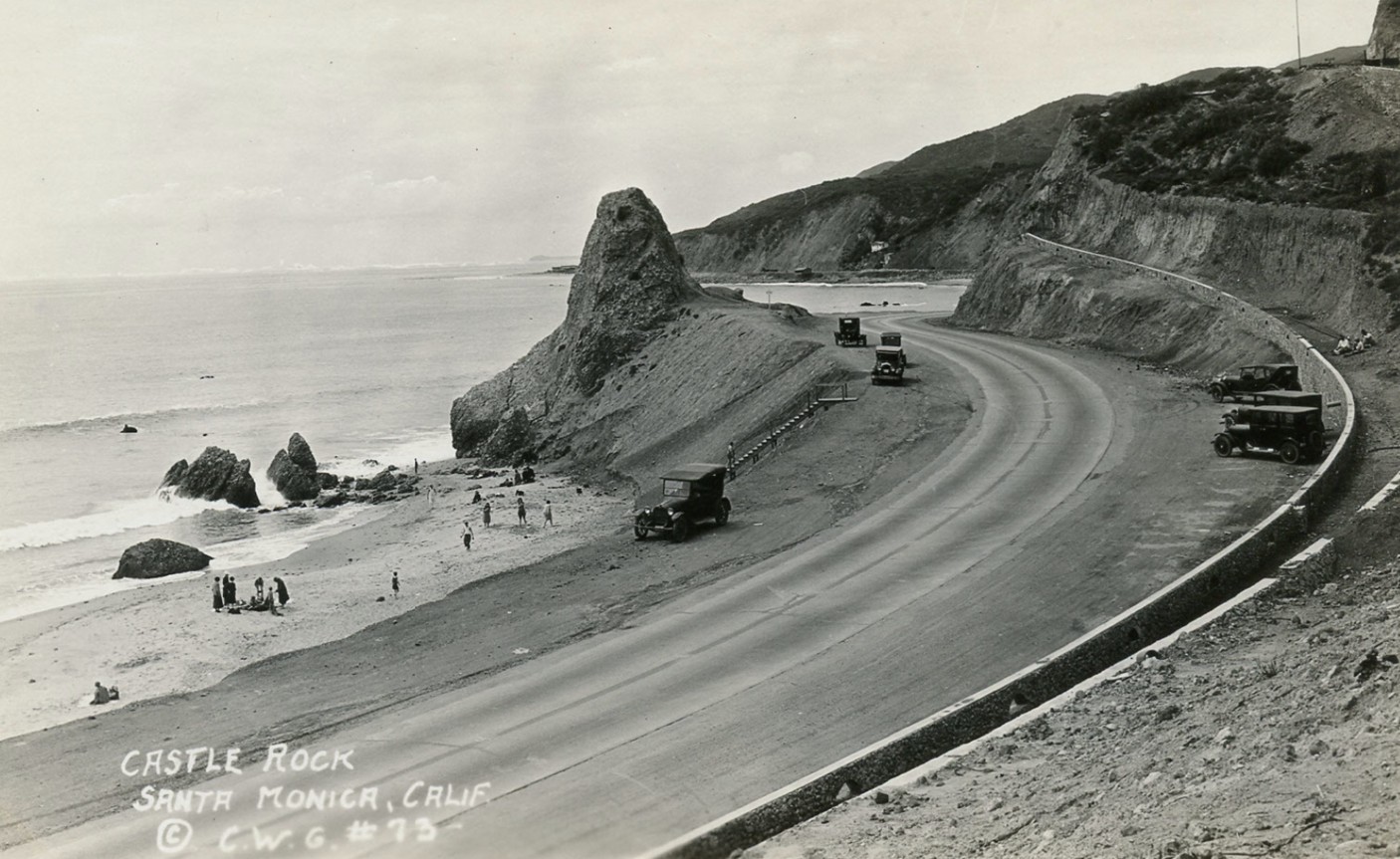 | (1927)* - A view of the palisades of Santa Monica, looking north along Roosevelt Highway next to an unbuilt beach (today's Will Rogers Beach). |